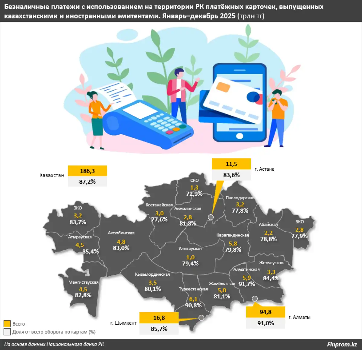 В региональном разрезе лидером по уровню «безнала» в 2025 году стала Алматинская область, где доля безналичных платежей составила 91,7% от всего оборота по картам, а объём — 5,9 трлн тг. Следом идут Алматы (91%) и Туркестанская область (90,8%).