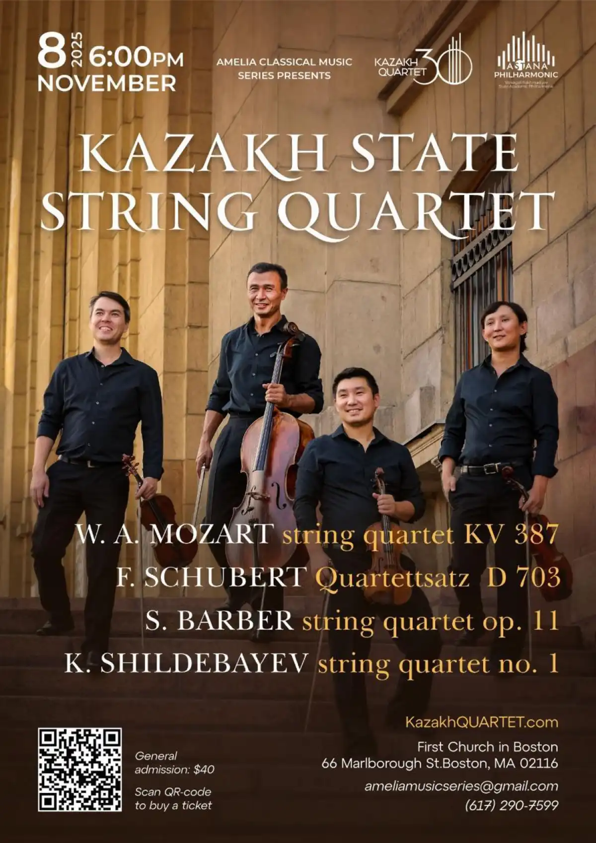 В программе американской части турне классика и современность: Моцарт, Брамс, Шуберт, К.Шильдебаев, Барбер. Слушатели смогут услышать богатство национальной школы в интерпретации, достойной лучших мировых сцен. После Нью-Йорка квартет выступит в Чарльз-тауне, Хатборо, Филадельфии, Мейпл-Глене и Бостоне.