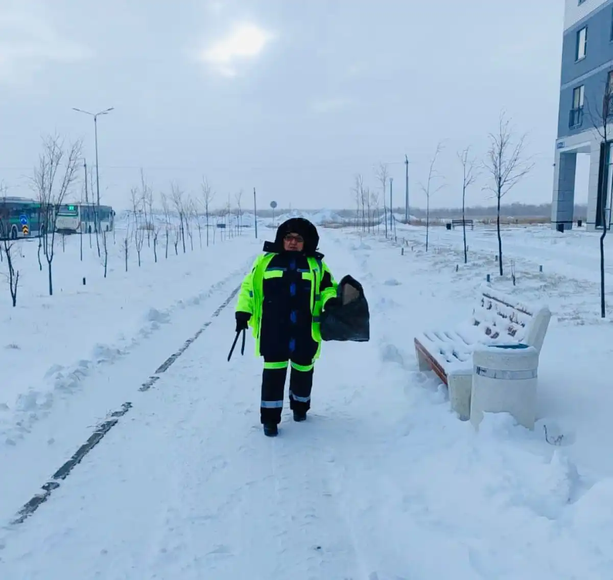 «У нас есть развозка, и каждый день мы выезжаем из аула Кобетей в три тридцать. К половине шестого уже в Астане, а в шесть утра начинаем рабочий день на участках: собираем мусор и складируем его в установленных местах, после чего грузчики забирают его и загружают в мусоровозы, направляющиеся на полигон. Кроме того, убираем снег, подметаем тротуары и дороги. Работаем до трёх часов дня, а к пяти вечера возвращаемся домой», – объясняет она.