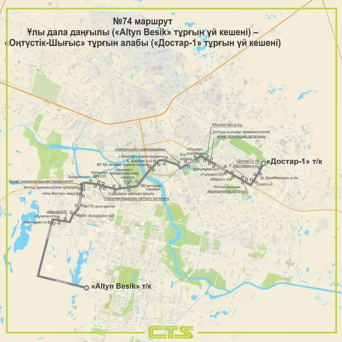 «Маршрут №67 улучшит транспортное обслуживание улицы Бухар жырау и обеспечит общественным транспортом новый участок улицы К. Кайсенова. Автобус №74 охватит новые участки улиц Ш. Айтматова и Улы дала, также обеспечит транспортным обслуживанием улицу Айтеке би. Маршрут №76 улучшит обслуживание общественным транспортом улицы А. Пушкина и прямо свяжет ЖМ «Железнодорожный» с торговыми объектами», – уточнили в CTS.