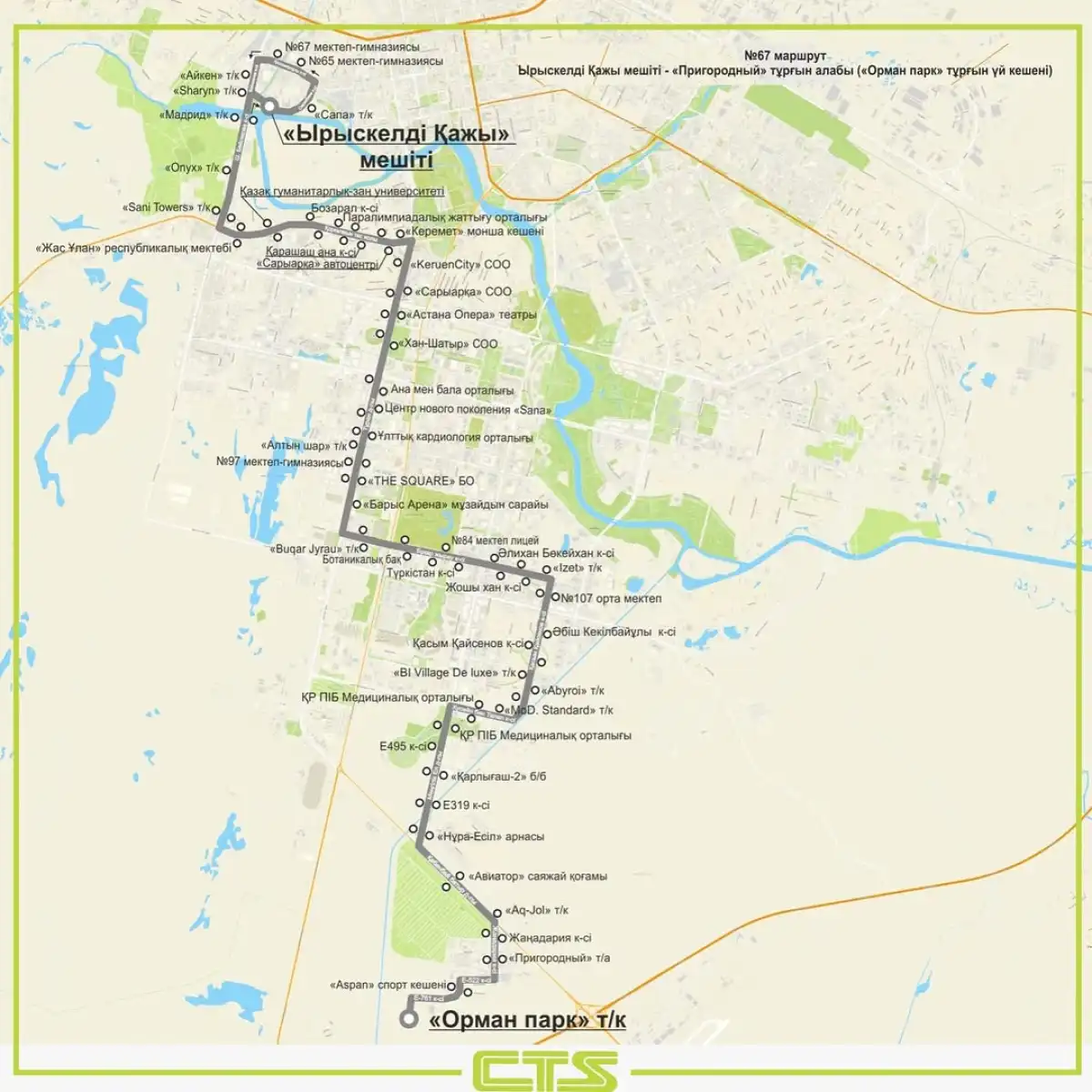 №67 – мечеть «Ырыскелді қажы» – жилой массив «Пригородный» (ЖК «Орман парк»);