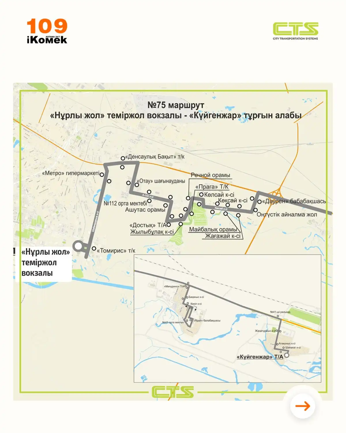 С 6 декабря в Астане начнет курсировать маршрут №75 по направлению железнодорожный вокзал «Нұрлы жол» – жилой массив «Куйгенжар».