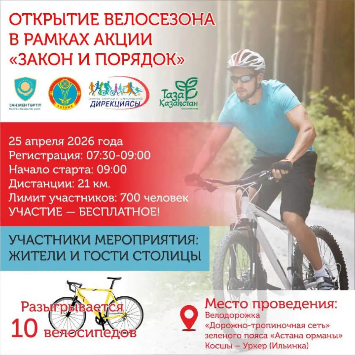 В честь открытия велосезона в столице пройдет велопробег протяженностью в 21 километр. Участники стартуют с кольцевой велодорожки по направлению Косшы и финишируют в парке «Зеленый пояс» в жилом массиве Ильинка (Уркер).