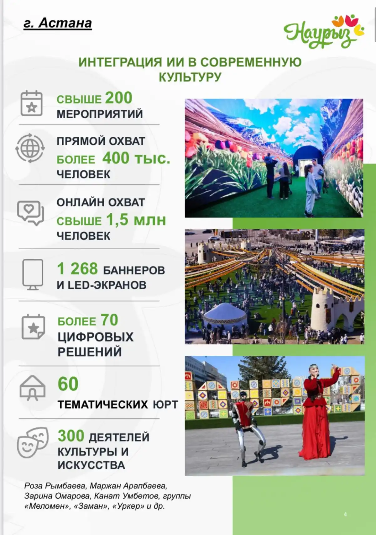 Столица Казахстана задала новый тренд в праздновании Наурыза, сделав упор на интеграцию искусственного интеллекта и современных технологий, передает Elordainfo.kz со ссылкой на официальный Telegram-канал Nauryznama.