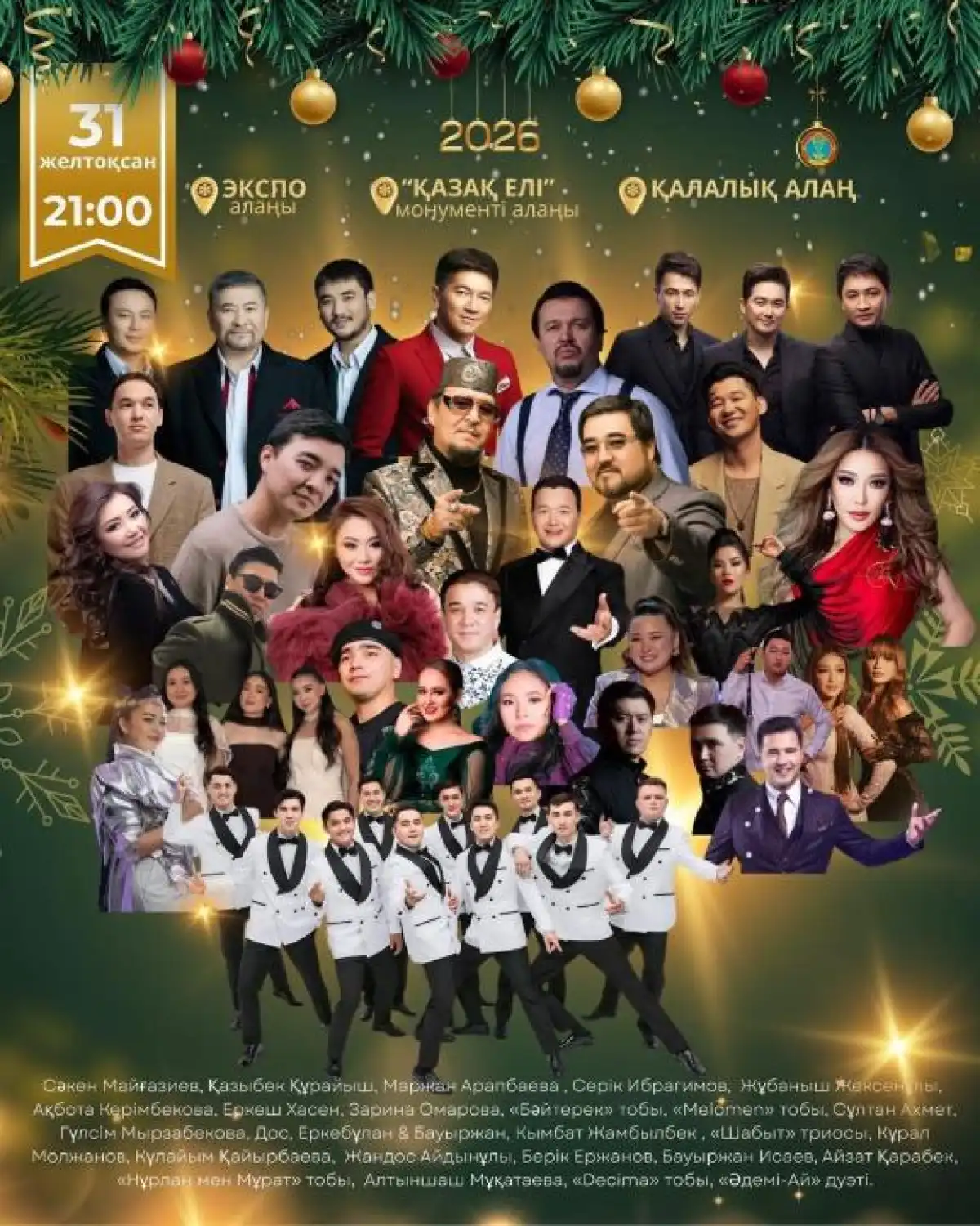 31 декабря с 21:00 на площади у монумента «Қазақ елі», на территории EXPO и на городской площади (перед акиматом) состоятся новогодние праздничные концерты с участием творческих коллективов и звезд казахстанской эстрады.
