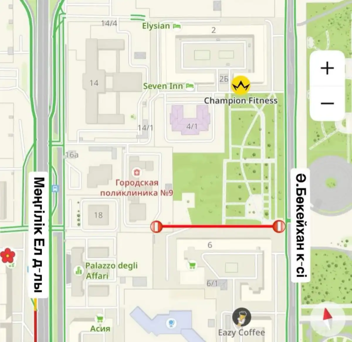 Проезд на вышеуказанном участке закрывают в связи с капитальным строительством улицы с сетями. Заезд к поликлинике будет осуществляться со стороны проспекта Мәңгілік Ел.