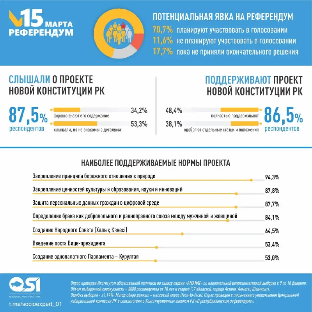 Отмечено, что опрос проведен Институтом общественной политики по заказу партии AMANAT по национальной репрезентативной выборке с 9 по 18 февраля. Объем выборочной совокупности – 8000 респондентов от 18 лет и старше (17 областей, города Астана, Алматы, Шымкент). Ошибка выборки - ±1,19%. Метод сбора данных – массовый опрос (face-to-face). Опрос проведен с письменного уведомления Центральной избирательной комиссии РК в соответствии с Конституционным законом РК «О республиканском референдуме».
