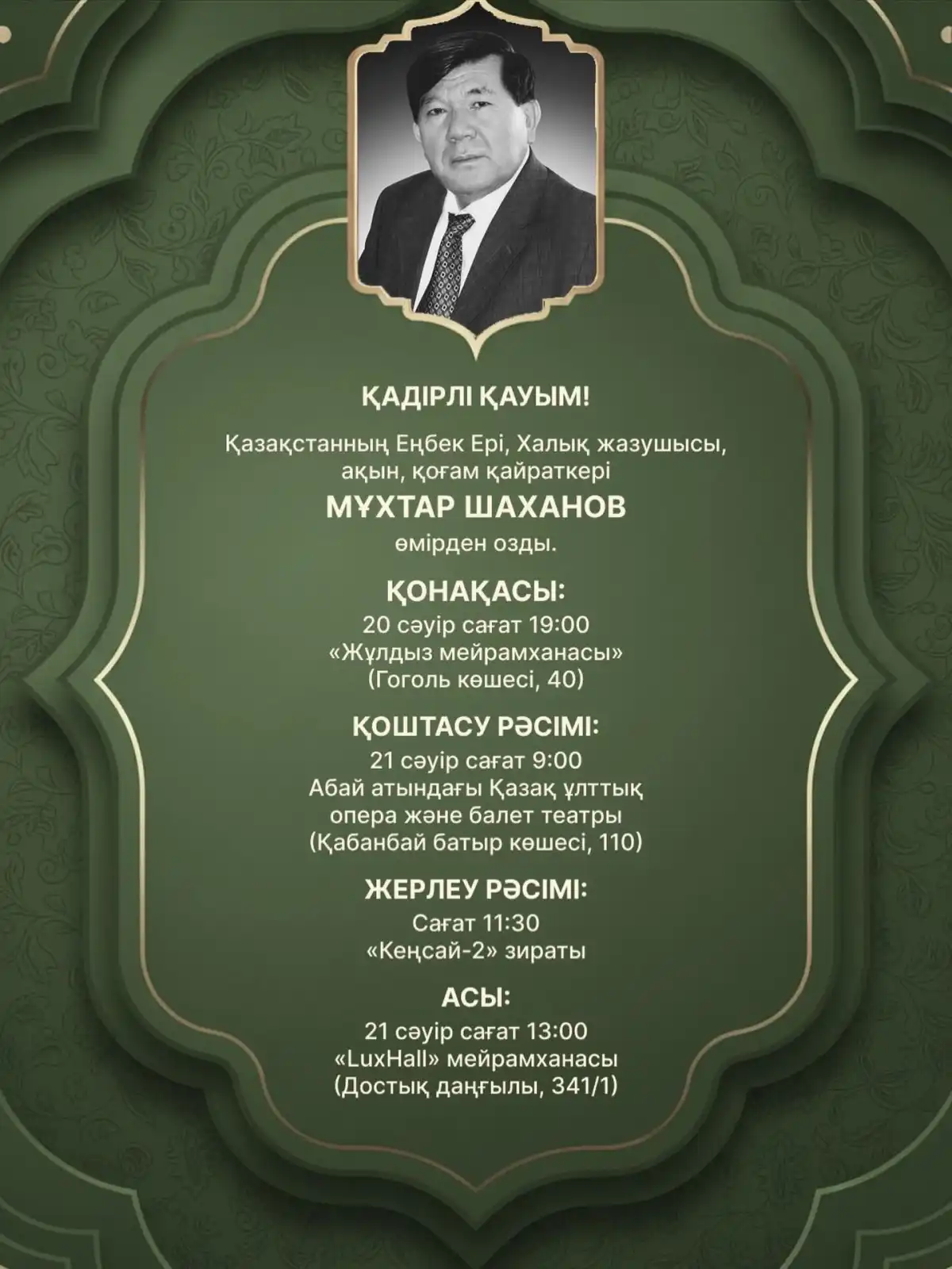 Напомним, знаменитый казахский поэт, общественный деятель Қазақстанның Еңбек Ері Мухтар Шаханов скончался 19 апреля 2026 года на 84-м году жизни.
