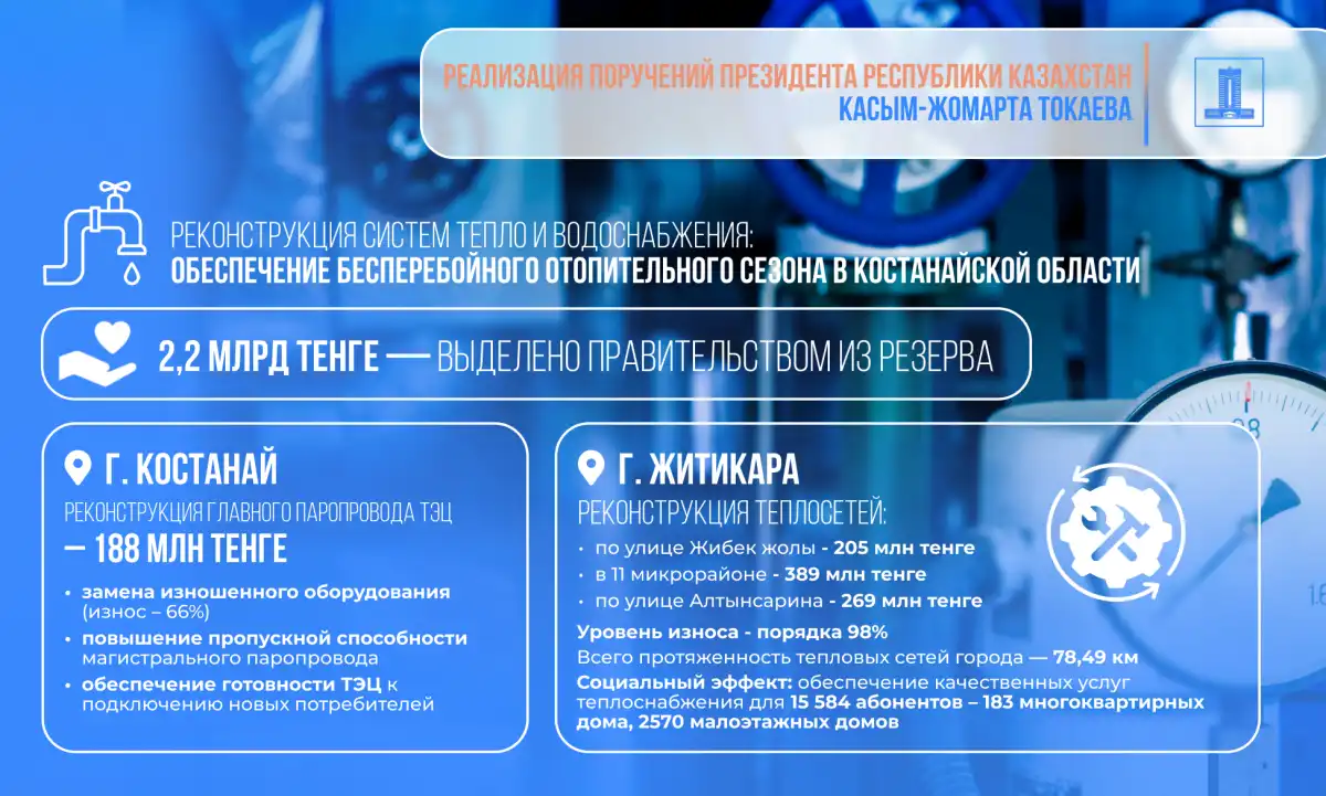 Средства направлены на ремонт объектов теплоснабжения городов Костаная, Житикары, Аркалыка и водоснабжения Рудного.