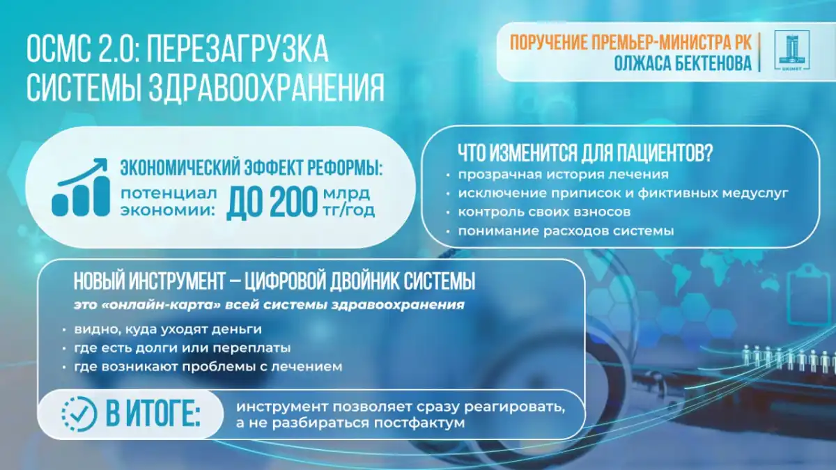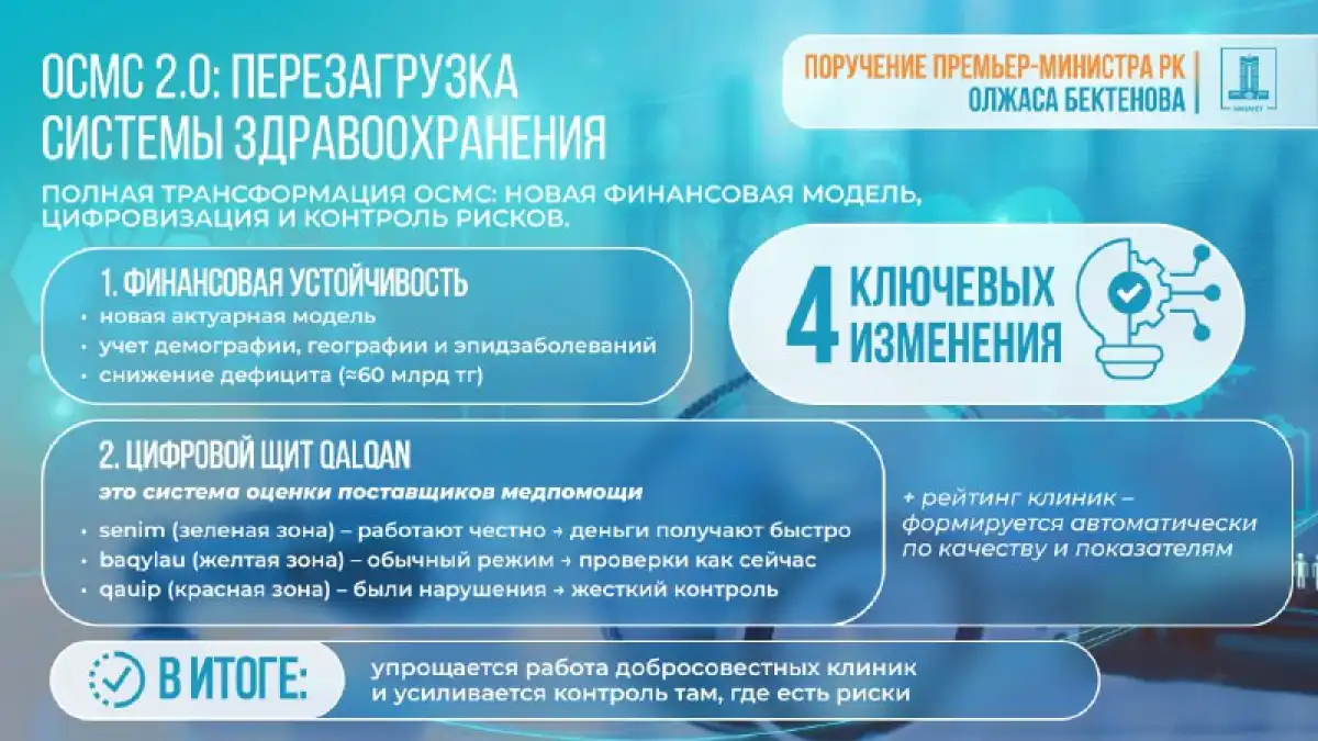 «На заседании Национального курултая Президент прямо обозначил основную проблему – хищение средств, выделяемых на здоровье нации. Это недопустимо. В этой связи принят ряд системных решений. Фонд передан в ведение Министерства финансов. Это сделано для блокировки существующих лазеек, исключения приписок, фальсификации документов и обеспечения жесткого финансового контроля. Главный принцип работы – каждый бюджетный тенге должен доходить до гражданина. В виде конкретной медицинской услуги, лекарственного препарата или медицинского изделия.