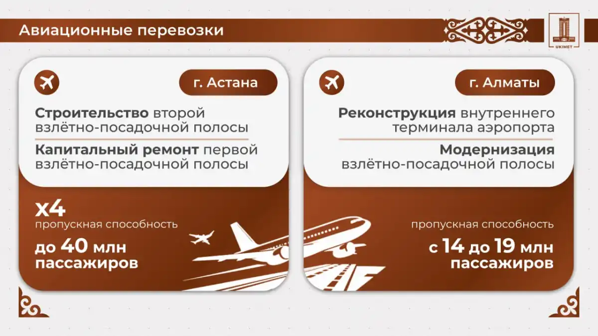 В этом году начнем строительство второй взлетно-посадочной полосы в аэропорту г. Астаны. Ввод в эксплуатацию второй полосы позволит приступить к капитальному ремонту первой, который не проводился более 20 лет. Это позволит увеличить пропускную способность аэропорта столицы в 4 раза, до 40 млн пассажиров.