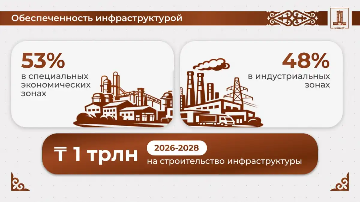 Вместе с тем, в специальных экономических зонах средняя обеспеченность инфраструктурой составляет лишь 53%, в индустриальных зонах – 48%.