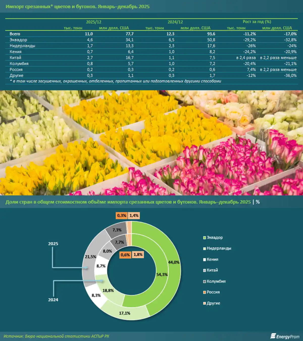 В Казахстане на 11,2% сократился импорт цветов. По данным Бюро национальной статистики (БНС) АСПиР РК, за январь–декабрь прошлого года в страну завезли около 11 тыс. тонн срезанных цветов и бутонов, или чуть более 168 млрд штук. За этот объём заграничные поставщики получили 77,7 млн долл. США — на 17% меньше, чем годом ранее, передает Elordainfo.kz со ссылкой на Energyprom.kz.