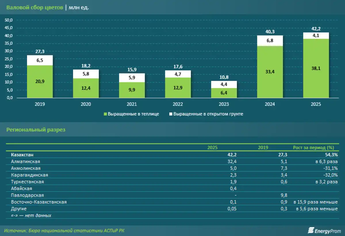 Тенденция уменьшения объёма импорта цветов в Казахстан наблюдается параллельно с наращиванием отечественного производства. В стране действительно стали выращивать больше своих цветов. По данным БНС, валовой сбор цветов в прошлом году составил 42,2 млн штук — на 4,7% больше, чем в 2024-м.