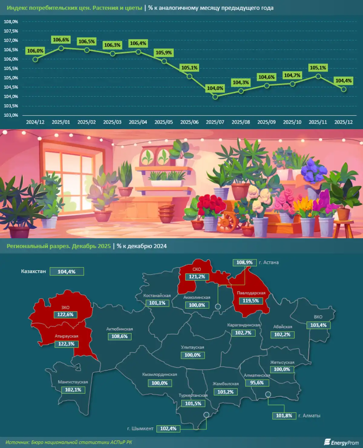 Стоит отметить, что именно в северных регионах Казахстана цветы дорожают быстрее всего. Например, в Павлодарской области в декабре прошлого года индекс потребительских цен на растения и цветы составил 119,5% при среднем показателе по РК в 104,4%. В соседней Северо-Казахстанской области цветы также сильно подорожали: на 21,2%. Высокие показатели роста цен также наблюдались в Атырауской (на 22,3%) и Западно-Казахстанской (на 22,6%) областях. На юге цены на цветы росли медленнее. В декабре прошлого года удорожание в такой категории товаров, как растения и цветы, в южных регионах и мегаполисах держалось в пределах 1%-2%.