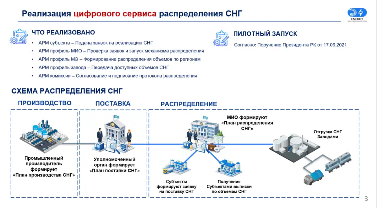 Цифровой сервис по плану поставки и распределения сжиженного нефтяного газа на внутренний рынок вне товарных бирж направлен на повышение прозрачности, управляемости и эффективности процессов распределения СНГ в Казахстане.
