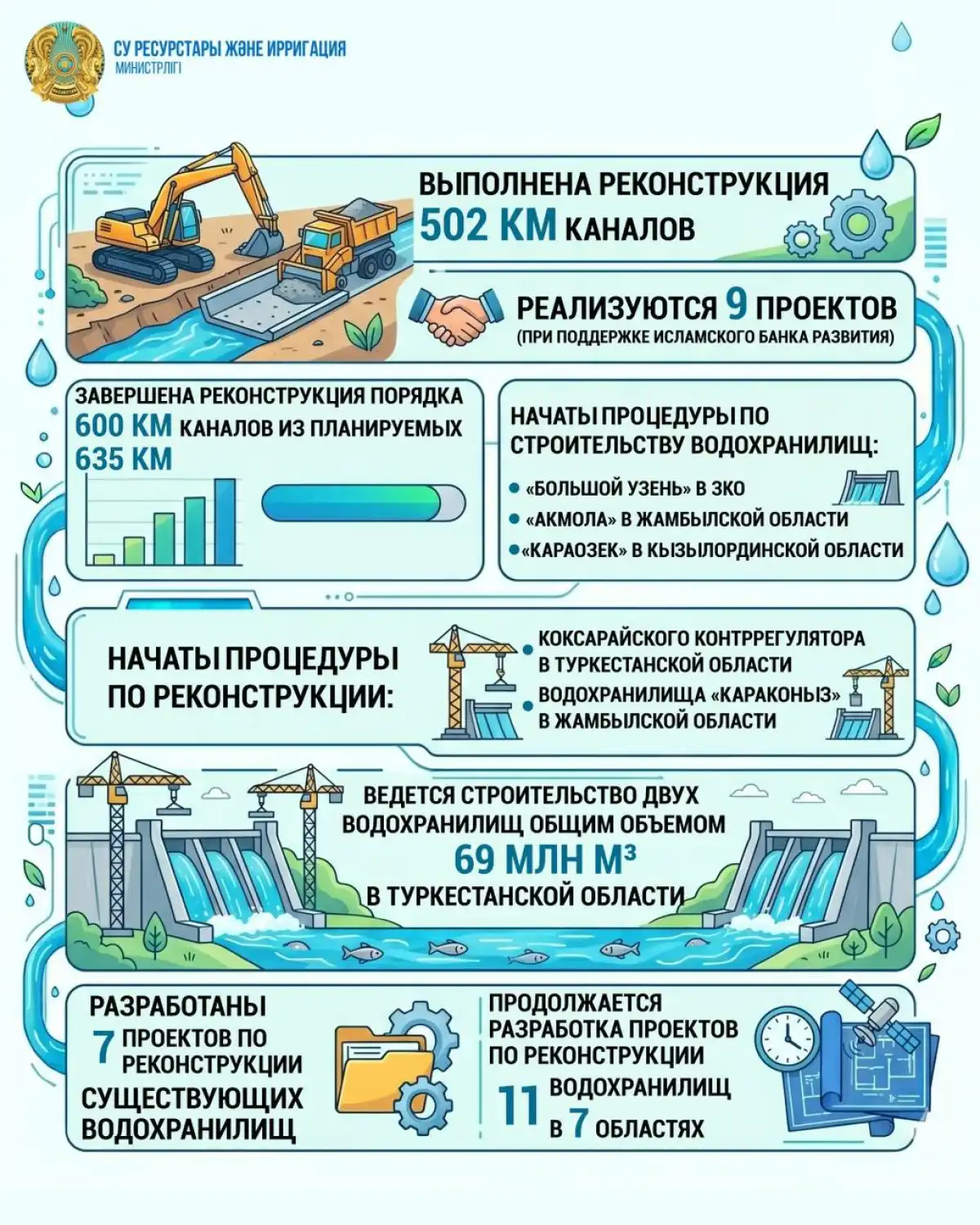 Кроме того, планируется строительство новых водохранилищ, в том числе «Большой Узень» в Западно-Казахстанской области, «Акмола» в Жамбылской области и «Караозек» в Кызылординской области. Также ведется работа по реконструкции существующих объектов.