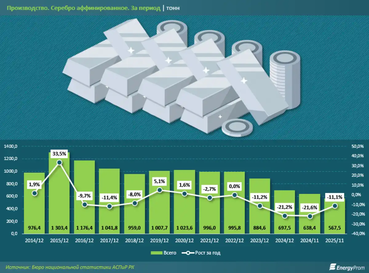 За январь–ноябрь 2025 года в стране было выпущено 567,5 тонн аффинированного серебра — на 11,1% меньше, чем за аналогичный период 2024-го.