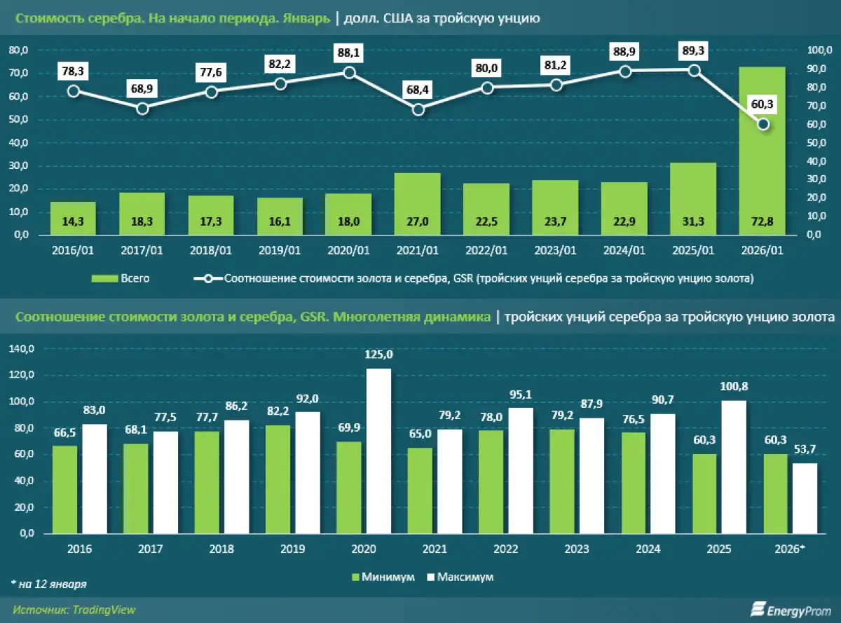 Соотношение стоимости золота и серебра (то есть количество тройских унций серебра, которое понадобится, чтобы купить одну тройскую унцию золота) сократилось с 89,3 на начало 2025-го до 60,3 на начало текущего года, а к 12 января 2026-го уменьшилось до 53,7. Для справки: исторически долгие годы показатель варьировался в пределах 10–15, а к началу 2000-х вырос до 50–60 тройских унций серебра за одну тройскую унцию золота. Наивысшей точки — 125 тройских унций серебра за одну тройскую унцию золота — он достиг во время пандемии коронавируса в 2020 году на фоне удорожания золота из-за паники на рынках. В следующем году соотношение стоимости золота и серебра варьировалось от 65 до 79,2, однако уже с 2022 года по причине геополитической напряжённости на фоне вторжения России в Украину спрос на золото как на защитный актив увеличил показатель до 100.