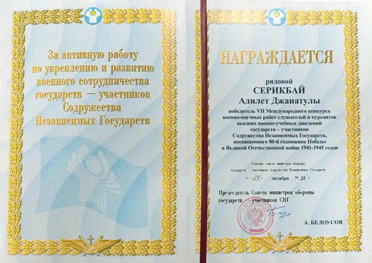 Победа казахстанского курсанта в международном конкурсе стала наглядным свидетельством высокого уровня подготовки будущих офицеров и укрепила авторитет нашей страны в системе военно-научного сотрудничества государств – участников СНГ.