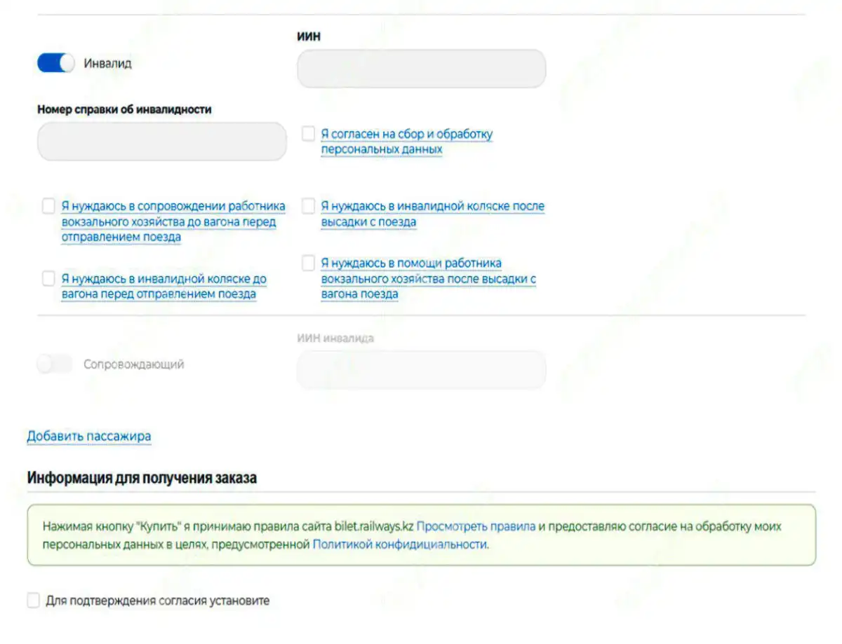 2. В процессе покупки выбрать опцию «Инвалид», указать ИИН и номер справки об инвалидности;