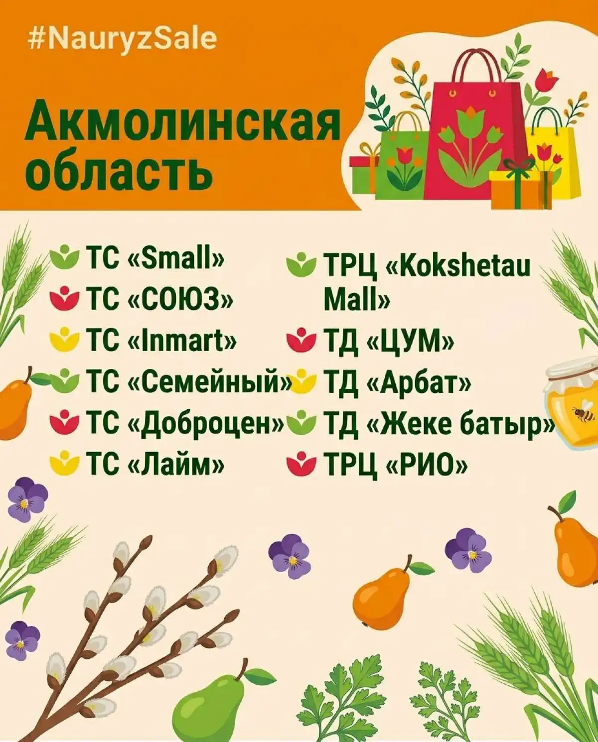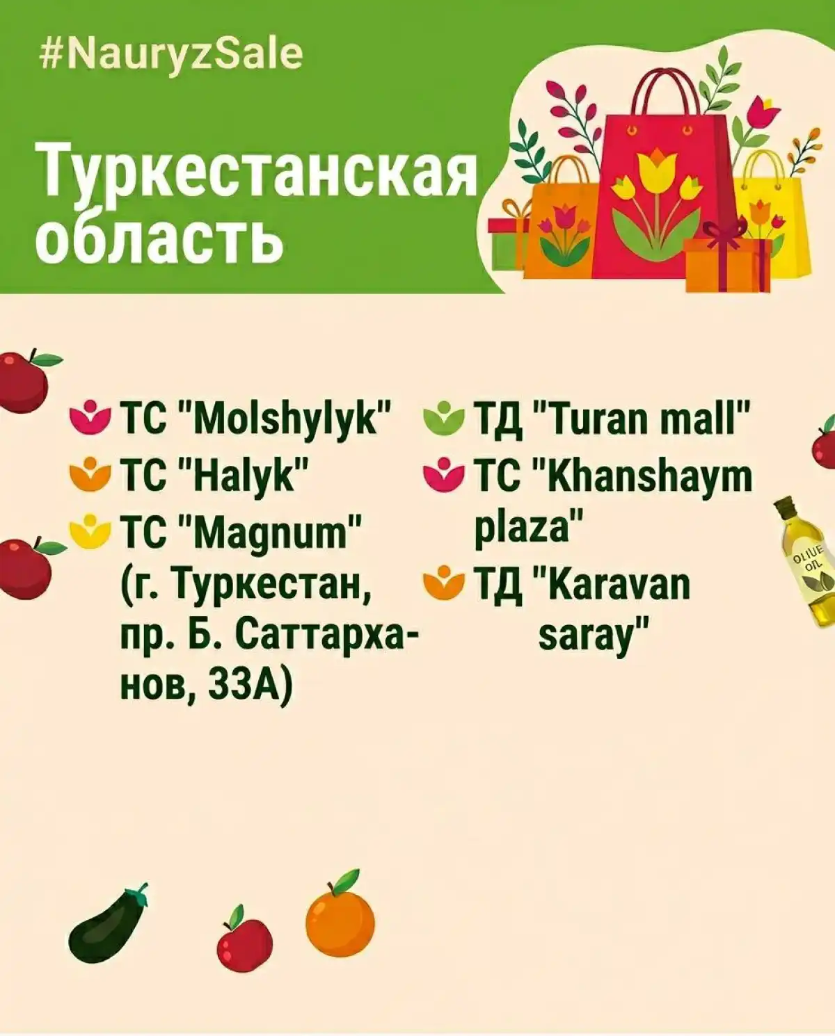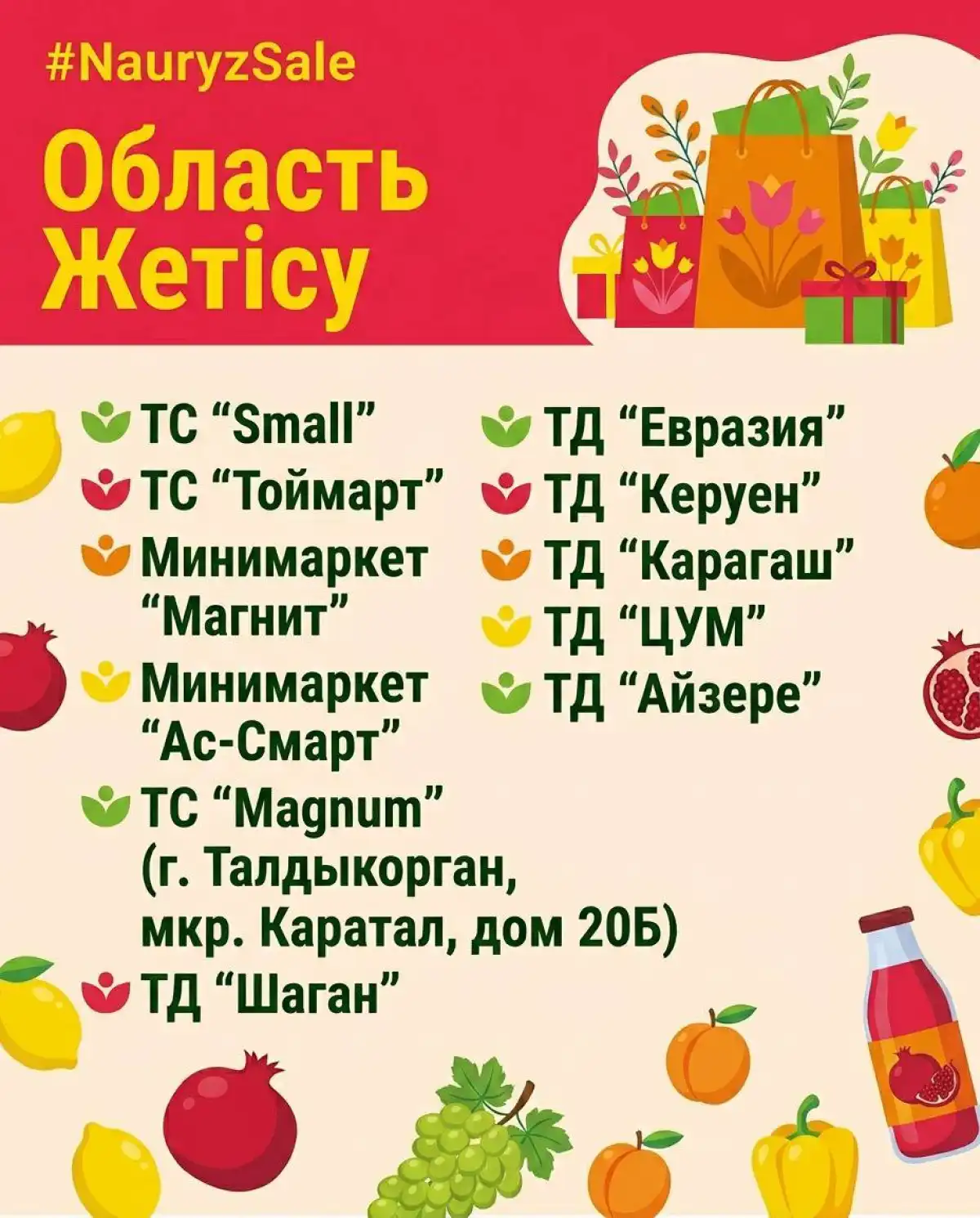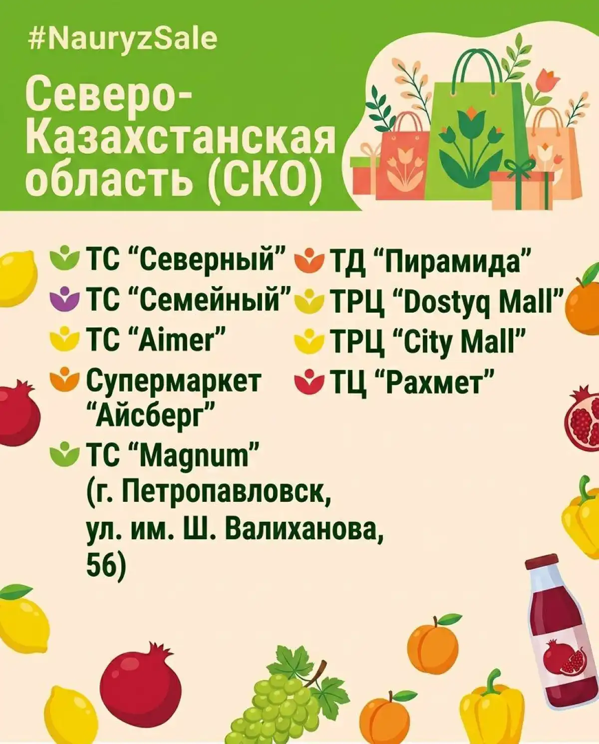 В акции примут участие около 300 субъектов внутренней торговли, включая 140 торговых домов и торгово-развлекательных центров, 140 торговых сетей и 20 субъектов электронной торговли. Это Magnum, Small, Galmart, «Анвар», «Дина», Toimart, «Астыкжан», «Аян», Greenwich и другие, а также крупные торговые дома и ТРЦ, в числе которых Mega Silk Way, Keruen, Keruen City, «Аружан», «Сарыарка», Shymkent Plaza и другие.
