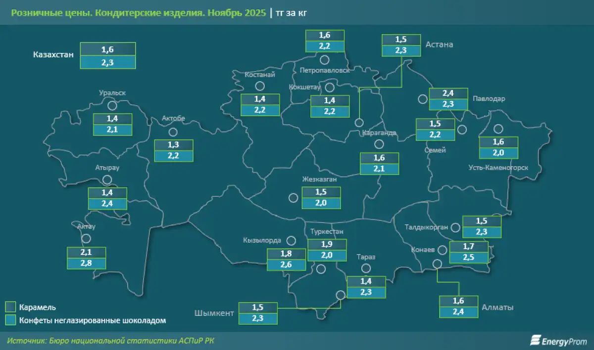 В региональном разрезе наибольшее годовое удорожание кондитерских изделий зафиксировано в Северо-Казахстанской области — на 27,5%. Следом идут Астана и Жетысуская область: на 26,7% и 26,3% соответственно. Значительный рост цен также отмечен в Шымкенте (24,5%), Павлодарской (23,5%) и Алматинской (23,1%) областях.
