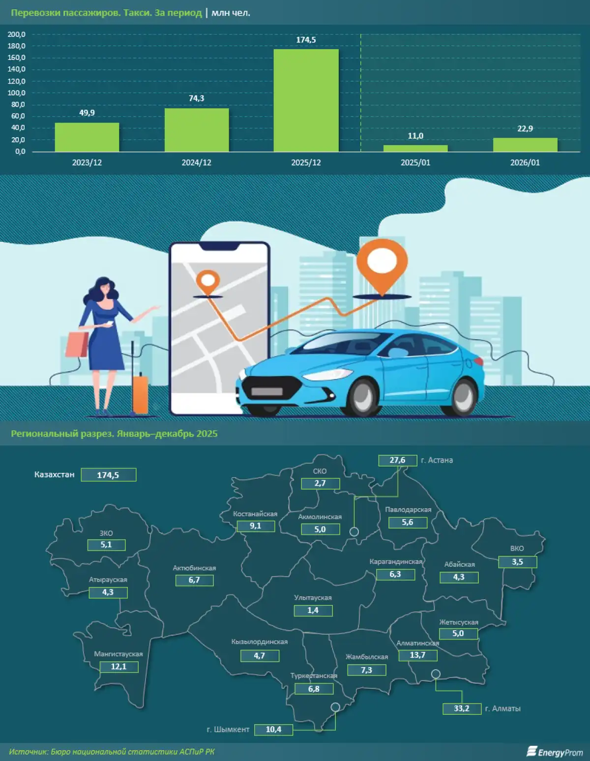 За январь–декабрь 2025-го казахстанские такси перевезли 174,5 млн пассажиров — в 2,4 раза больше, чем годом ранее, и в 3,5 раза больше, чем за январь–декабрь 2023-го. Рост носит устойчивый характер и не является разовым всплеском. Для сравнения: в январе 2026-го было перевезено 22,9 млн человек — в 2,1 раза больше, чем в январе 2025-го. Таким образом, тенденция сохраняется и в начале текущего года, передает Elordainfo.kz со ссылкой на Energyprom.kz.