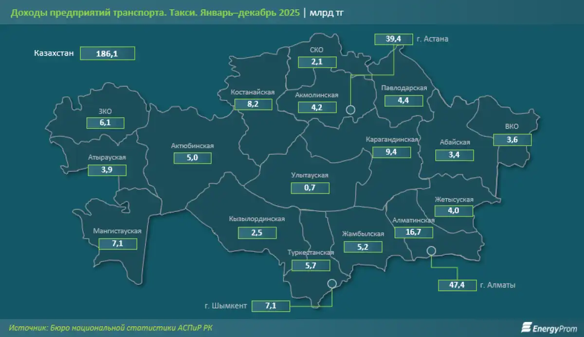 Совокупный доход предприятий такси по всему Казахстану за январь–декабрь 2025 года составил 186,1 млрд тг. Из них почти половина — 46,6% — всех доходов в секторе совокупно сформировали лишь два города — Алматы (47,4 млрд тг) и Астана (39,4 млрд тг). Значительные объёмы также пришлись на Алматинскую (16,7 млрд тг) и Карагандинскую (9,4 млрд тг) области.