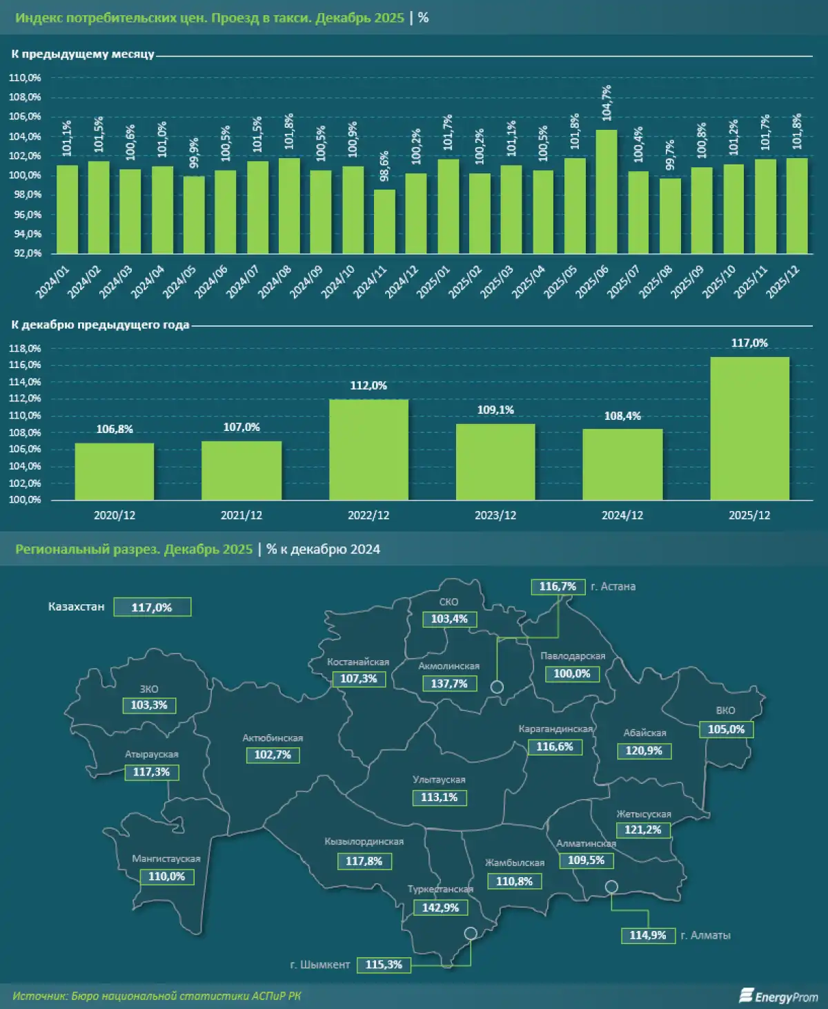 Услуги такси в РК по итогам декабря прошлого года подорожали на 1,8% за месяц. На протяжении 2025-го цены повышались почти ежемесячно. Единственным исключением стал август, когда было зафиксировано снижение, но лишь на 0,3%. Самый резкий скачок произошёл в июне: сразу на 4,7% за месяц.
