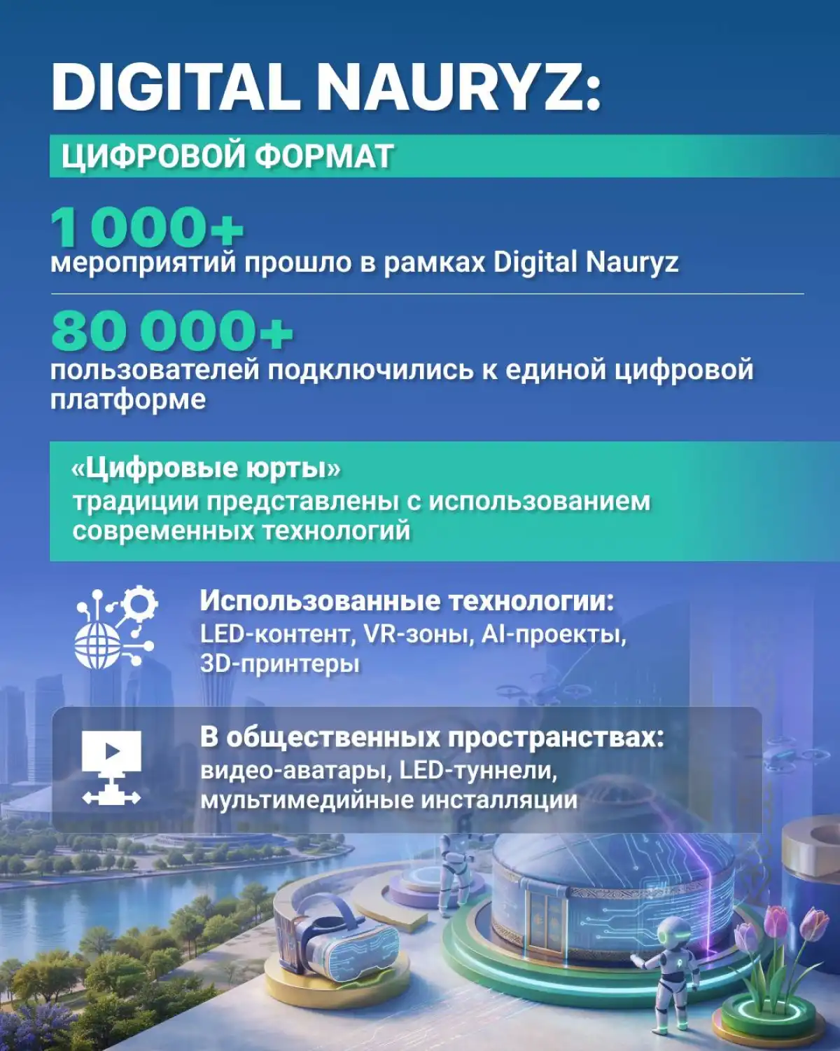 Особое внимание было уделено цифровому формату. В рамках инициативы Digital Nauryz реализовано более 1 тысячи мероприятий, а к единой цифровой платформе подключились более 80 тысяч пользователей.