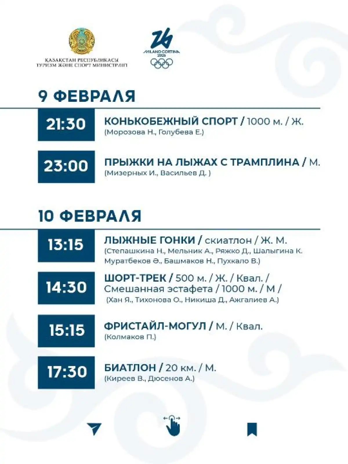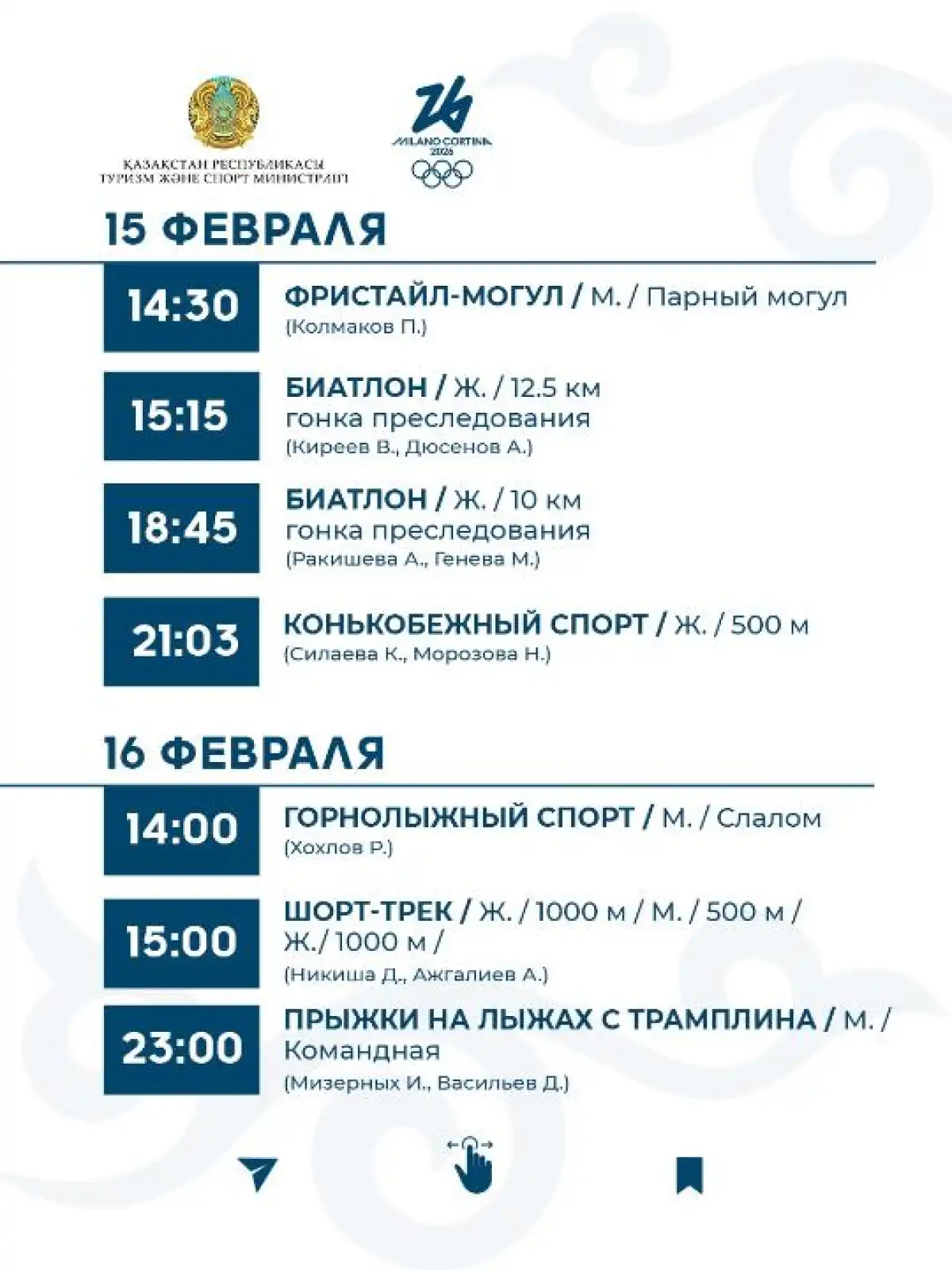 Министерство туризма и спорта РК опубликовало расписание выступлений сборной Казахстана на зимней Олимпиаде-2026 в Италии, передает Elordainfo.kz.