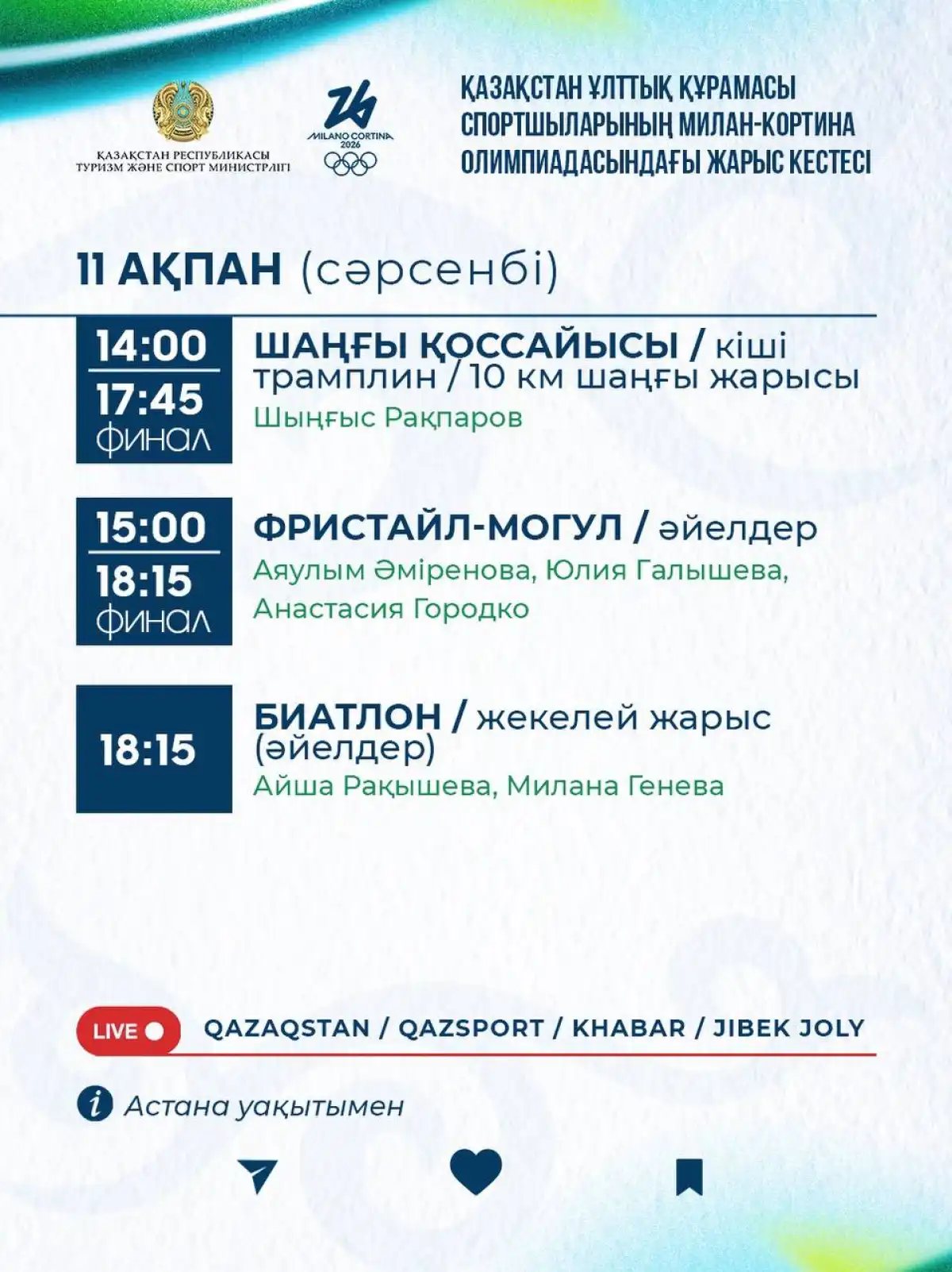 Министерство спорта и туризма РК подготовило расписание выступлений казахстанцев на Олимпийских играх на 11 февраля, передает Elordainfo.kz со ссылкой на Министерство спорта и туризма РК.