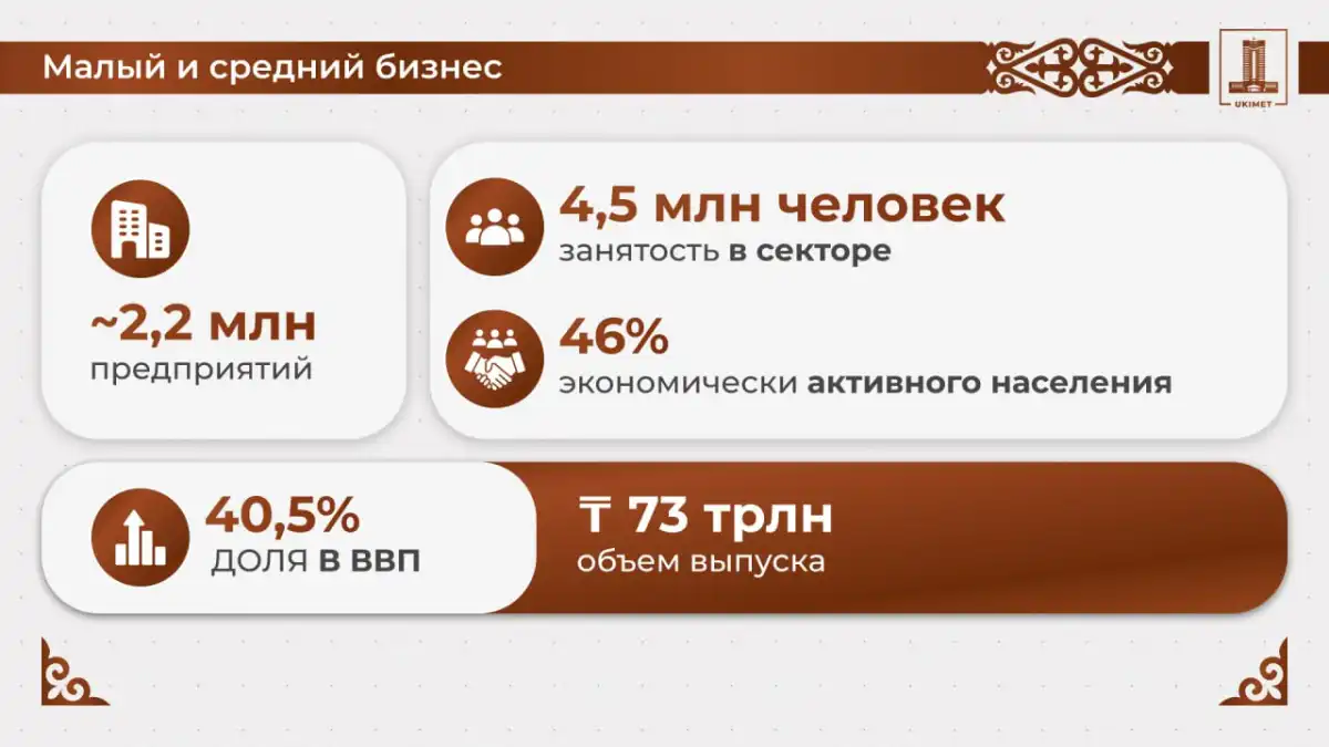 Доля МСБ в валовом внутреннем продукте составила 40,5%, объем выпуска продукции – порядка 73 трлн тенге.