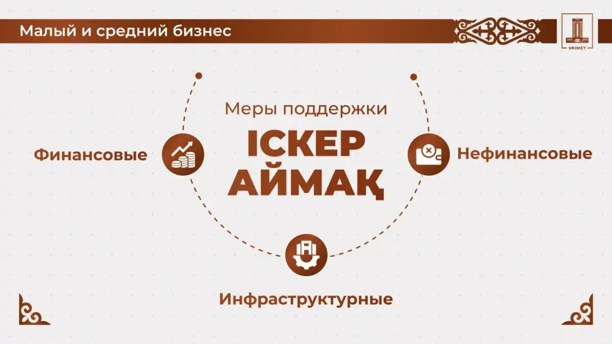 В соответствии с Вашим поручением по обеспечению экономической стабильности утверждена программа «Іскер Аймақ», систематизирующая меры финансовой, нефинансовой и инфраструктурной поддержки для субъектов микро и малого бизнеса, — отметил Олжас Бектенов.
