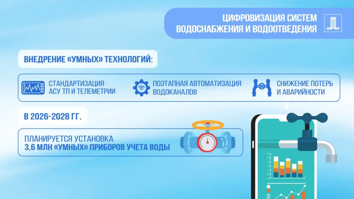 В 2026-2028 годах планируется установить более 3,6 млн «умных» счетчиков воды, что позволит существенно оптимизировать расходы воды и увеличить срок службы оборудования.