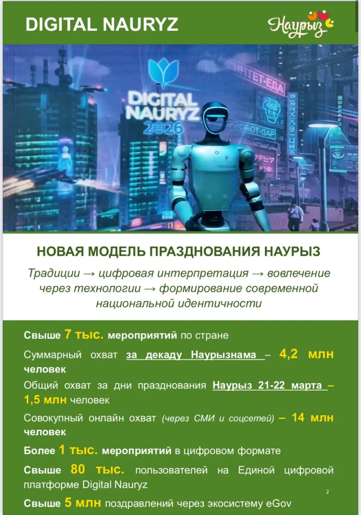 За декаду «Наурызнама» по всей стране прошло свыше 7 тысяч мероприятий, из которых более тысячи состоялись в цифровом формате. Общий онлайн-охват в соцсетях и СМИ достиг 14 миллионов человек, а через экосистему eGov казахстанцы отправили более 5 миллионов праздничных поздравлений.