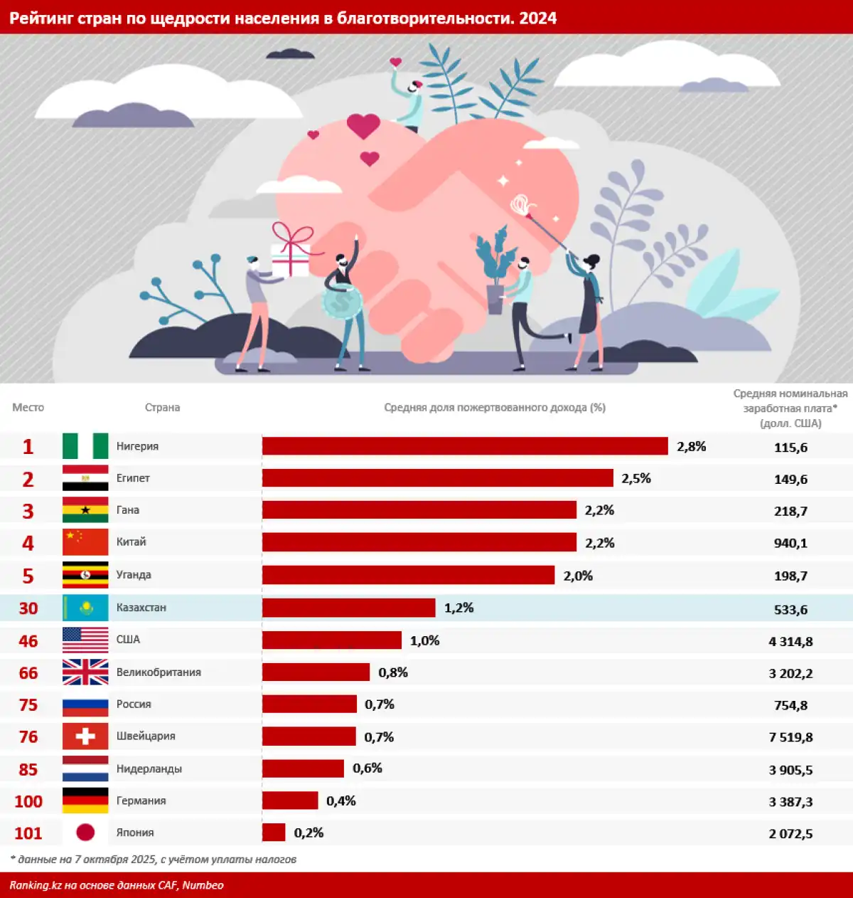 Чтобы оценить уровень щедрости, социологи разных государств по заказу CAF провели социологические исследования в 101 стране. Главный индикатор определения щедрости в благотворительности, который рассчитывали эксперты CAF — средняя доля благотворительного пожертвования от дохода человека. В опросах принимали участие и жители Казахстана. Оказалось, что в РК люди готовы тратить на благотворительность 1,2% дохода. С этим показателем Казахстан занял 30-е место в рейтинге. Это весьма неплохой результат: уровень щедрости казахстанцев оказался гораздо выше, чем в развитых странах — США, Великобритании, Германии, Нидерландах.