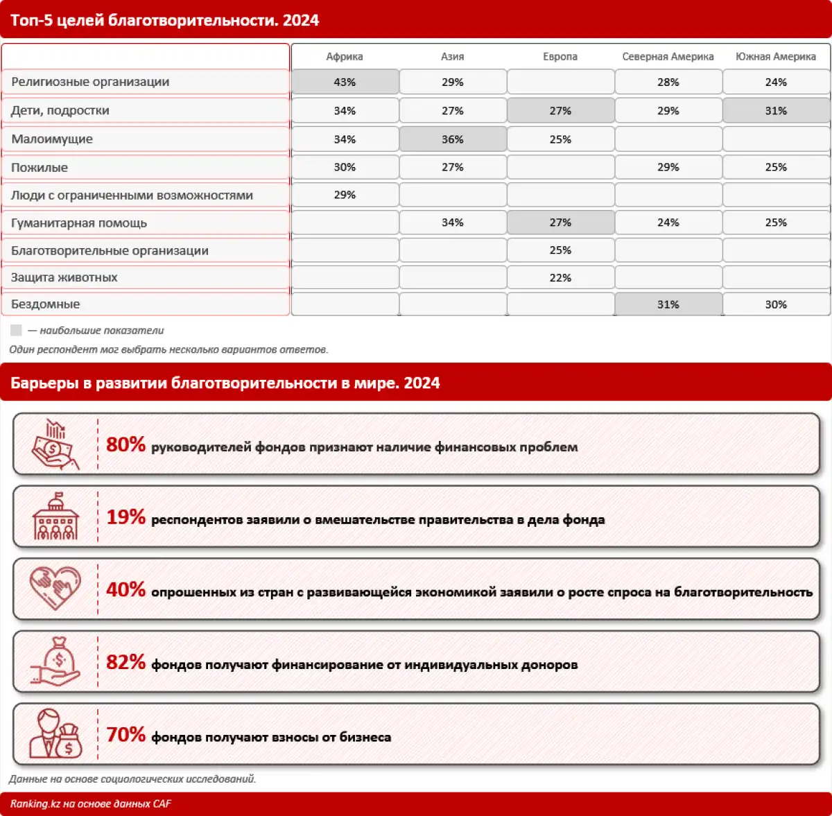 Любопытно, как сильно отличается распределение целей в богатых и бедных странах. Например, в Африке 43% респондентов-благотворителей помогают религиозным организациям. Далее идут дети, малоимущие, пожилые, люди с ограниченными возможностями. В Европе первое место делят между собой гуманитарная помощь и поддержка детских и молодёжных организаций. На эти две категории пришлись одинаковые доли респондентов: по 27%. Четверть опрошенных из европейских государств сообщили, что помогают благотворительным организациям и малоимущим, ещё 22% указали, что перечисляют деньги на защиту животных. В Северной Америке на первом месте среди целевых групп оказались бездомные, а второе разделили пожилые люди и молодёжные организации.