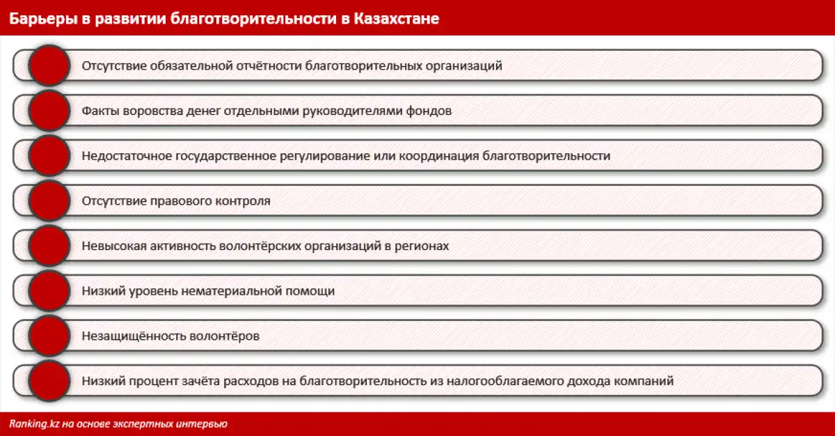 Речь идёт не только о деле Перизат Кайрат, которая в суде первой инстанции была признана виновной в хищении 3,5 млрд тг — средств фонда Biz Birgemiz Qazaqstan 2030. Весной прошлого года специалисты Агентства РК по финансовому мониторингу озвучивали и другие факты, подрывающие доверие к сборам на благотворительность. Всё это привело к тому, что в Казахстане заговорили о недостаточном государственном регулировании и координации деятельности благотворительных фондов, отсутствии правового контроля за ними, их непрозрачности. Среди других проблем, которые часто влияют на решения казахстанских доноров, стоит отметить незаинтересованность крупных компаний, так как доля вычета этих расходов из налогооблагаемого дохода остаётся малой.