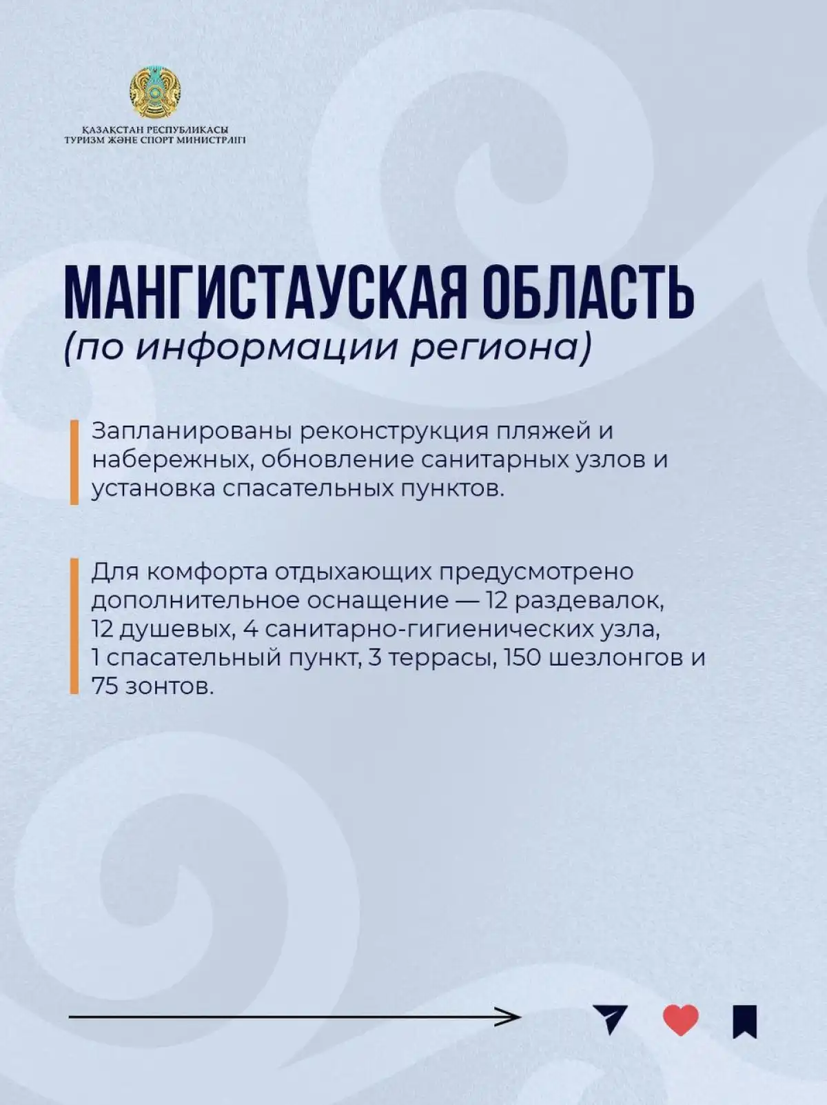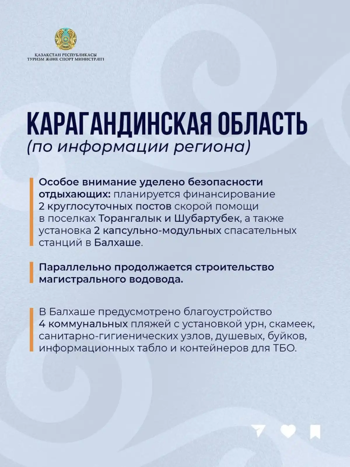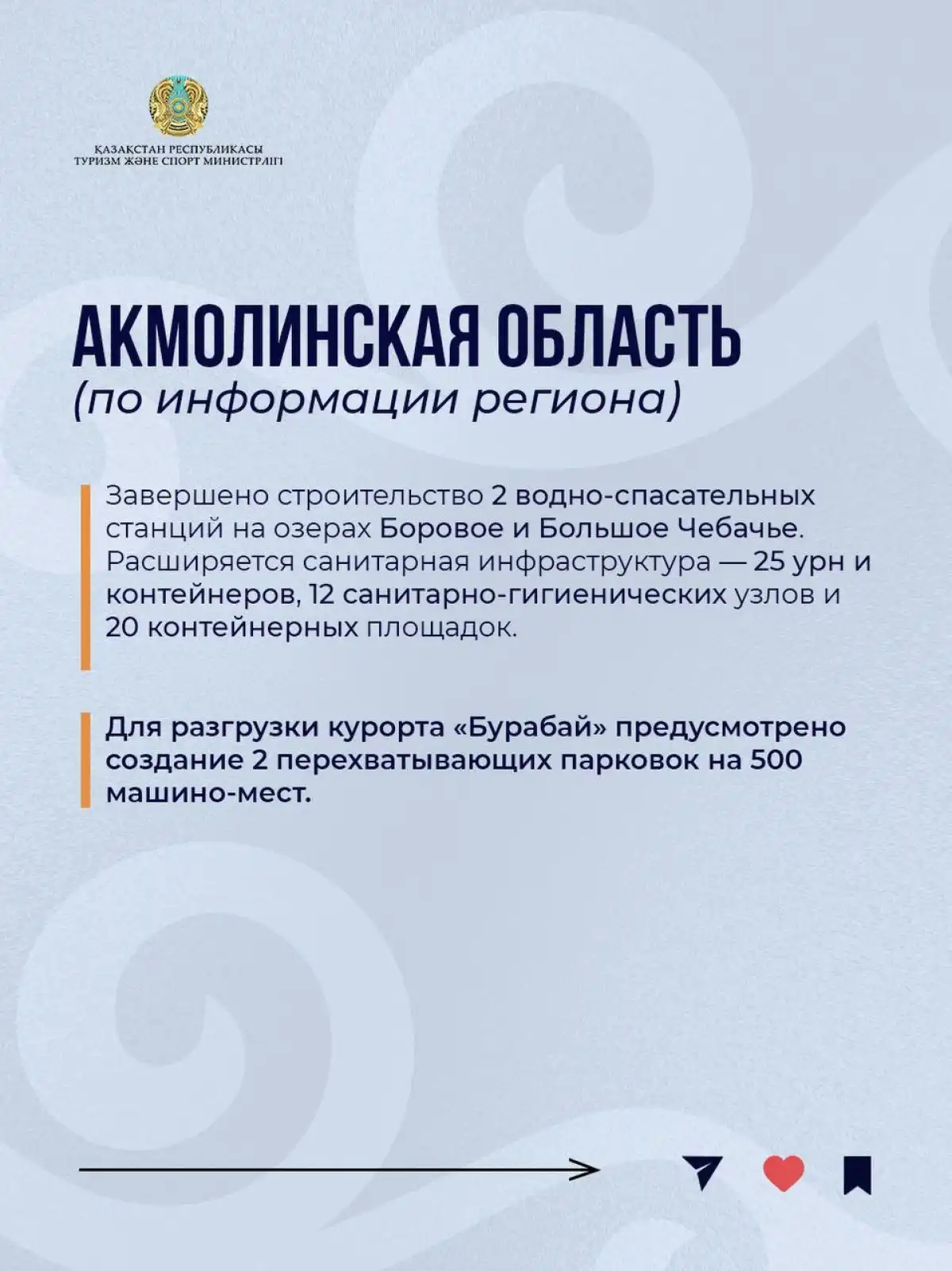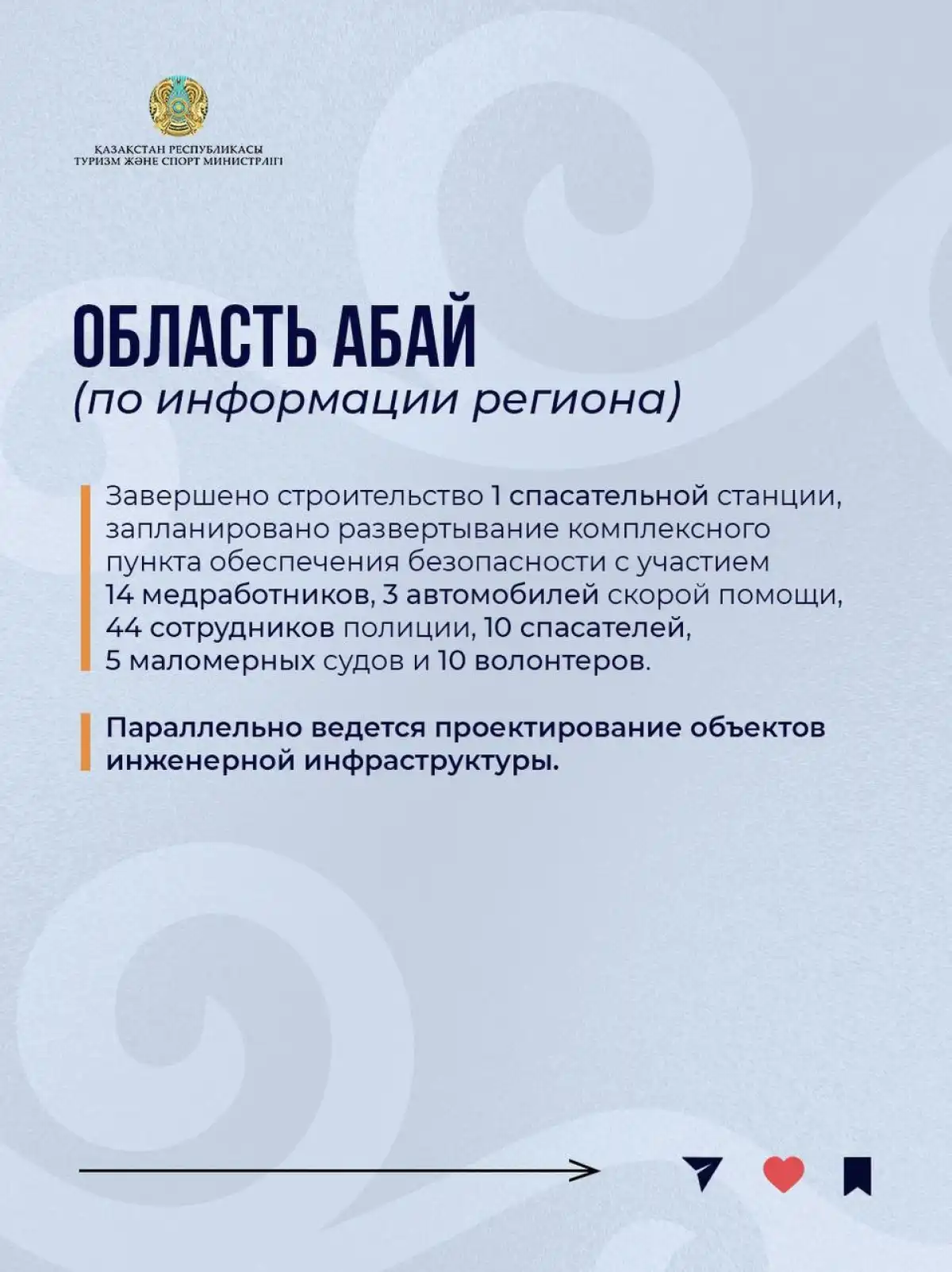 «По итогам мониторинга регионы реализуют комплексные меры по повышению уровня безопасности, развитию инфраструктуры и улучшению качества сервиса. Это позволит обеспечить комфортные и безопасные условия для отдыхающих и повысить туристскую привлекательность Казахстана», – отмечают в Минтуризма.