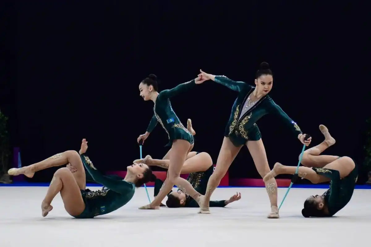 В групповых упражнениях среди взрослых сборная Казахстана заняла первое место в многоборье, набрав 48,75 балла.
