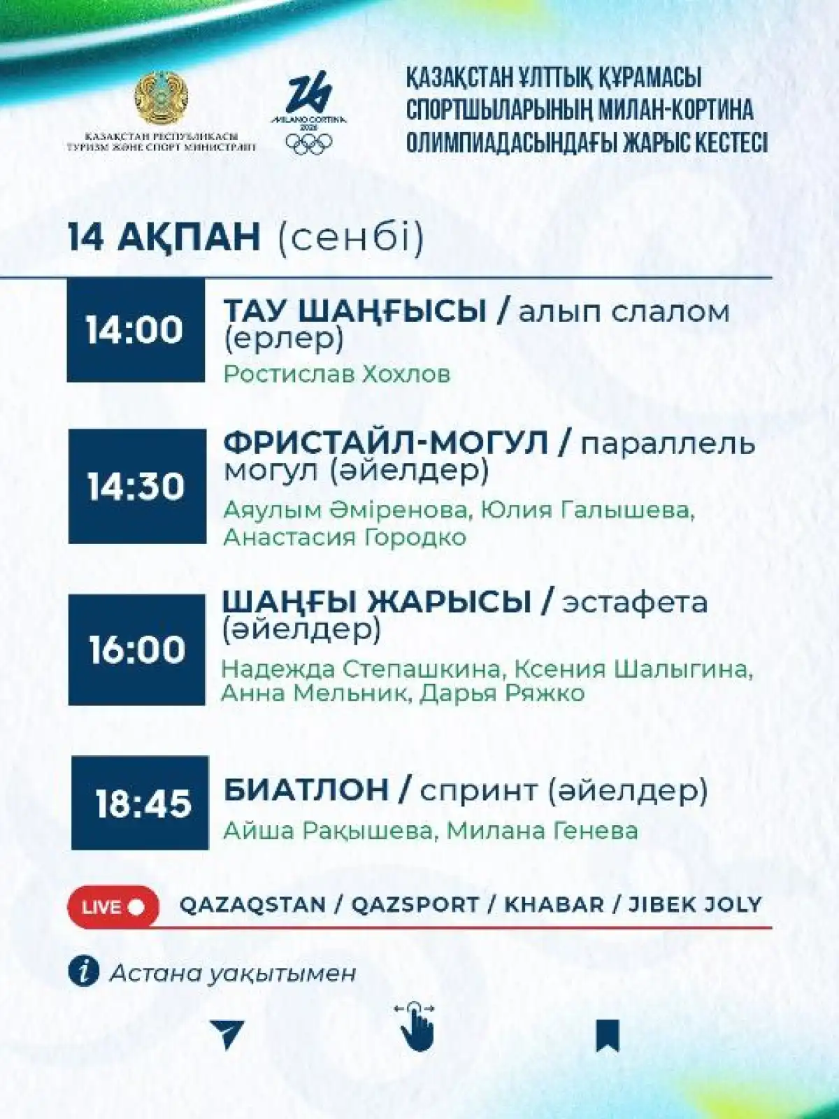 Министерство спорта и туризма РК опубликовало расписание выступлений казахстанцев на Олимпийских играх на 14 февраля, передает Elordainfo.kz.